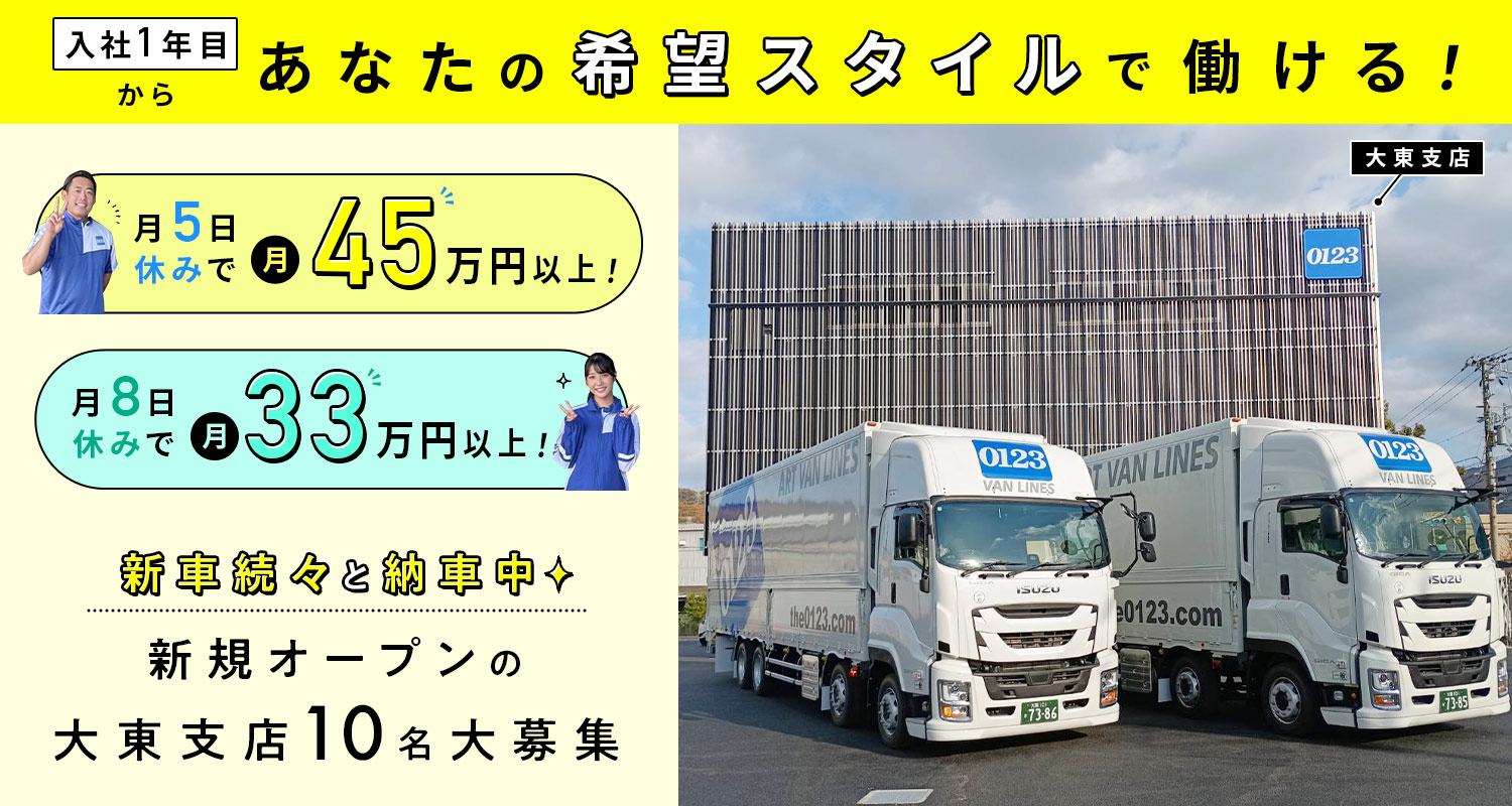 | 会社情報 | アートバンライン株式会社 大東支店 □□□ 本社所在地:大阪府大阪市中央区城見1-2-27 クリスタルタワー 3F 事業内容:一般貨物自動車運送事業、他 |