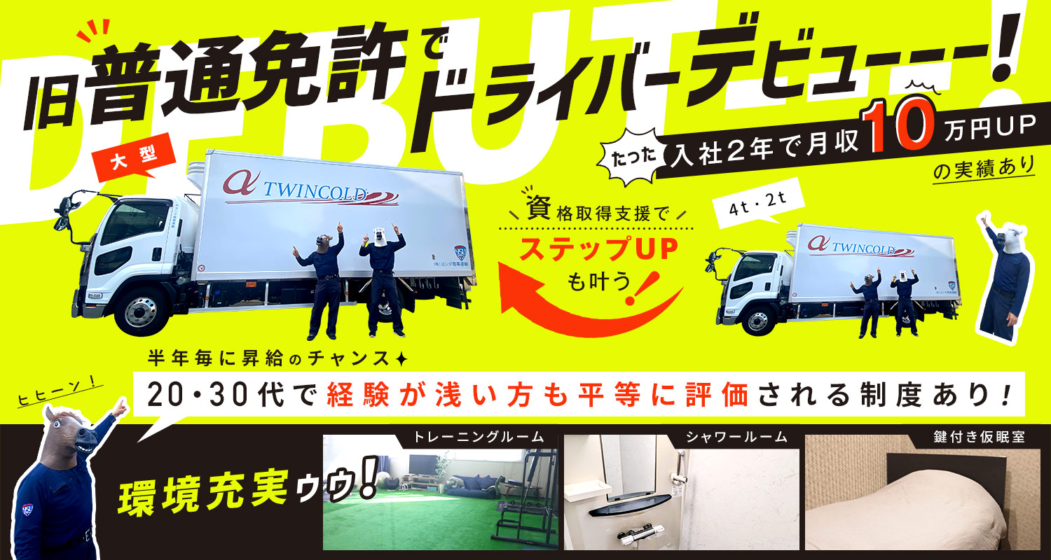 | 応募資格 | 旧普通免許で応募OK (平成19年(2007年)6月1日以前に普通免許を取得した方) ※平成19年(2007年)6月2日以降に普通免許を取得の方は要準中型、中型免許 ※未経験OK!ドライバーデビュー歓迎 ※入社後、大型免許の取得可能(規程あり) |