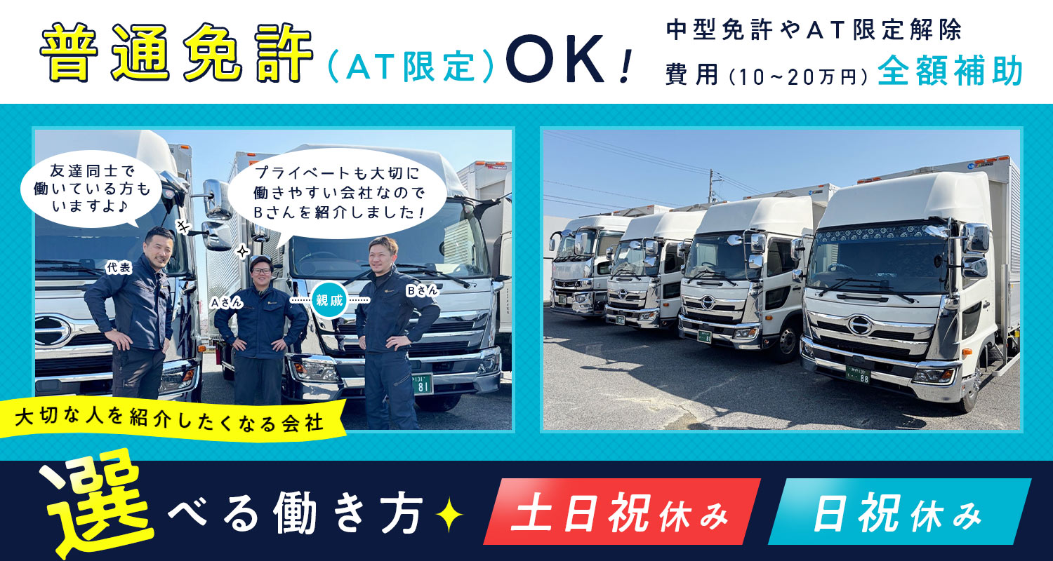 | 応募資格 | 普通自動車免許(AT限定OK) ※中型免許の取得、AT限定解除の支援制度あり※会社全額負担(規定あり) 免許取得が必要な方は、取得までは横乗りもしくは2トントラックでの配送をお任せします。 ※2007(平成19)年6月1日以前に取得の普通自動車免許(MT)をお持ちの方は、そのまま運転可能 ※ドライバー未経験大歓迎 |
