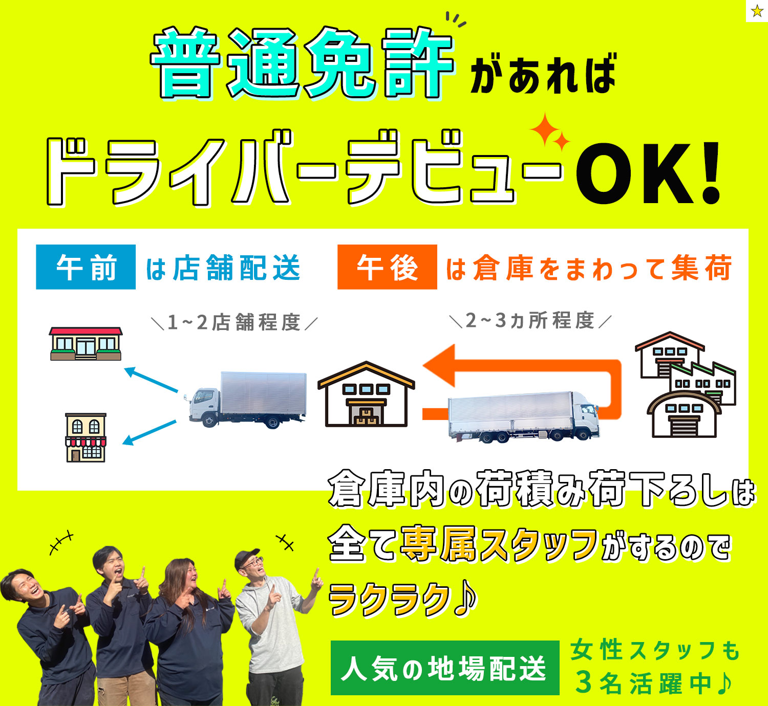 女性でもご活躍いただけます!実際、女性ドライバーが3名活躍しています!