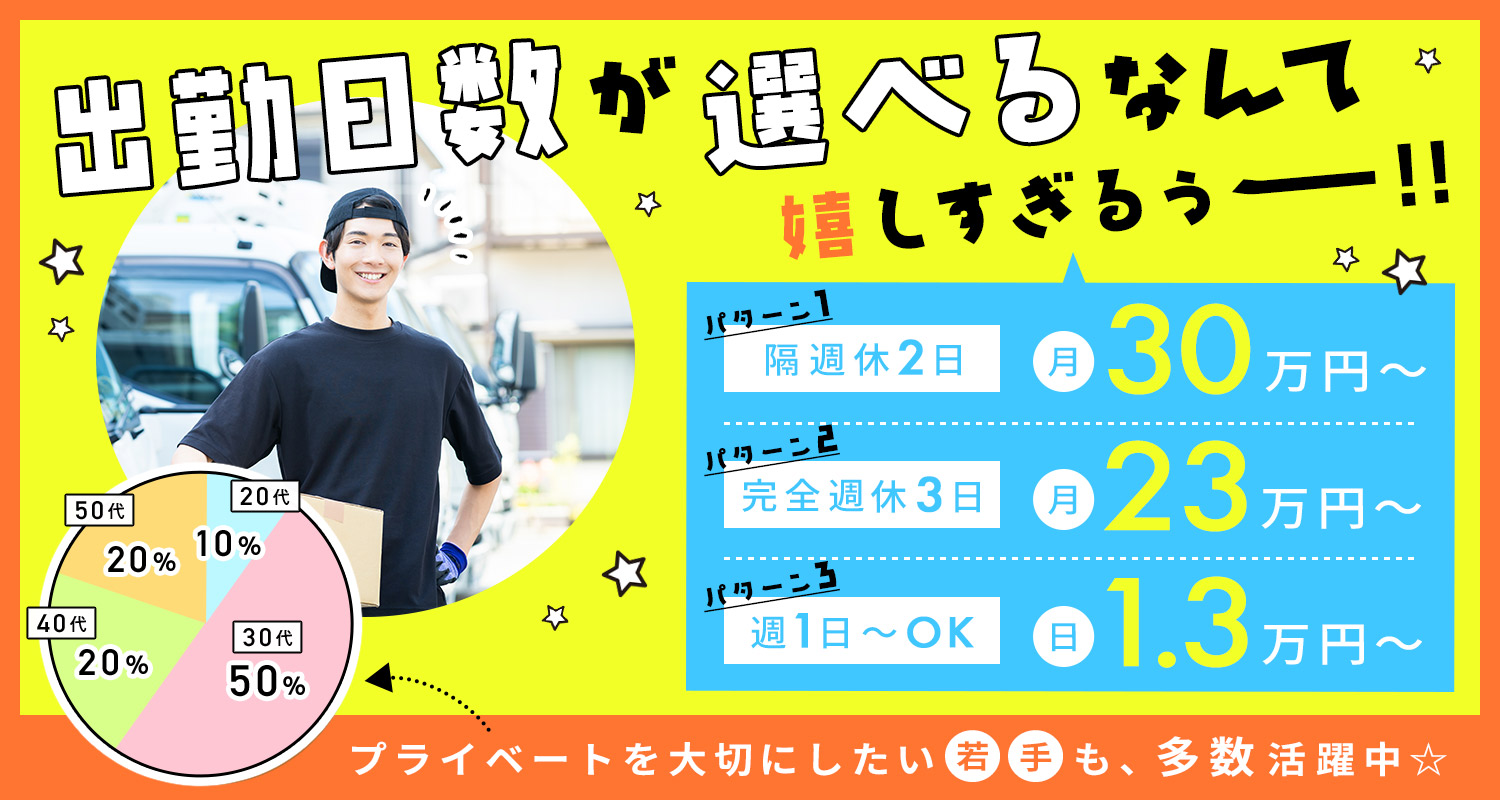 | 給 与 | 日給1万3000円~ ※希望者は、週払いも可能(規定あり) ※先輩の助手席で仕事を学ぶ横乗り期間中は、日給1万2000円~(期間は経験・能力による) |
