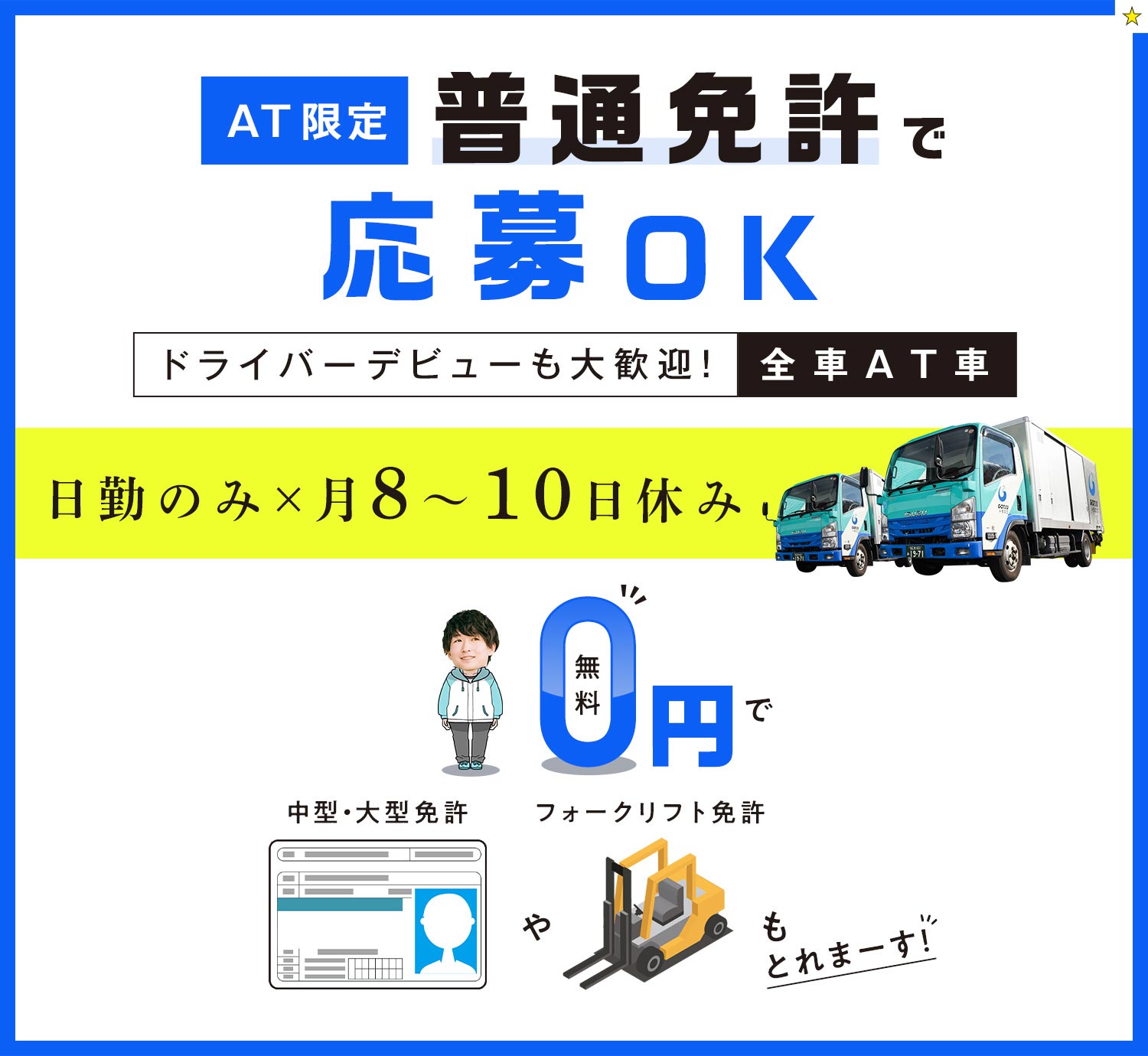 | 応募資格 | AT限定 普通自動車免許で応募OK! ※免許取得時期は不問 ※ドライバー未経験OK ※準中型、中型、大型免許、フォークリフト免許お持ちの方も大歓迎 ※性別・学歴・職歴など不問 |