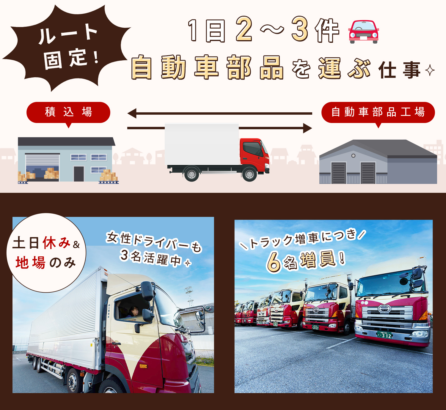 大型トラックに乗り、「積込場」⇔「自動車部品工場」を1日2~3往復!