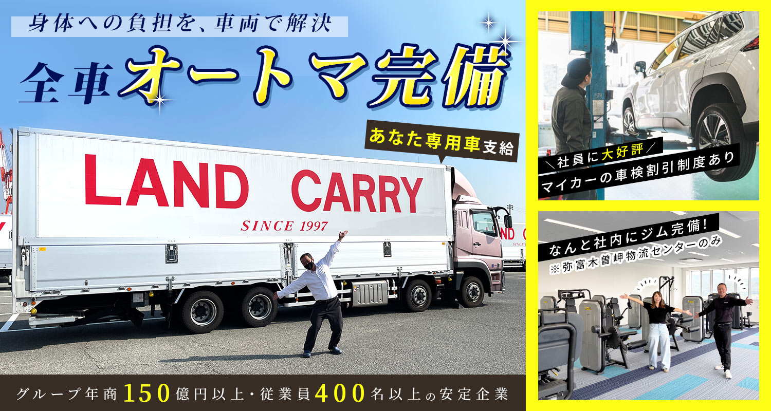 | 会社情報 | 株式会社ランドキャリー 岐阜営業所 □□□ 本社所在地:愛知県春日井市神屋町字地福1265番地1 事業内容:一般貨物自動車運送事業 <ランドキャリーグループについて> ・事業所数:愛知本社ほか4営業所+7センターを展開 ・トラック保有台数:280台 ・従業員数:420名以上(2025年9月時点) |