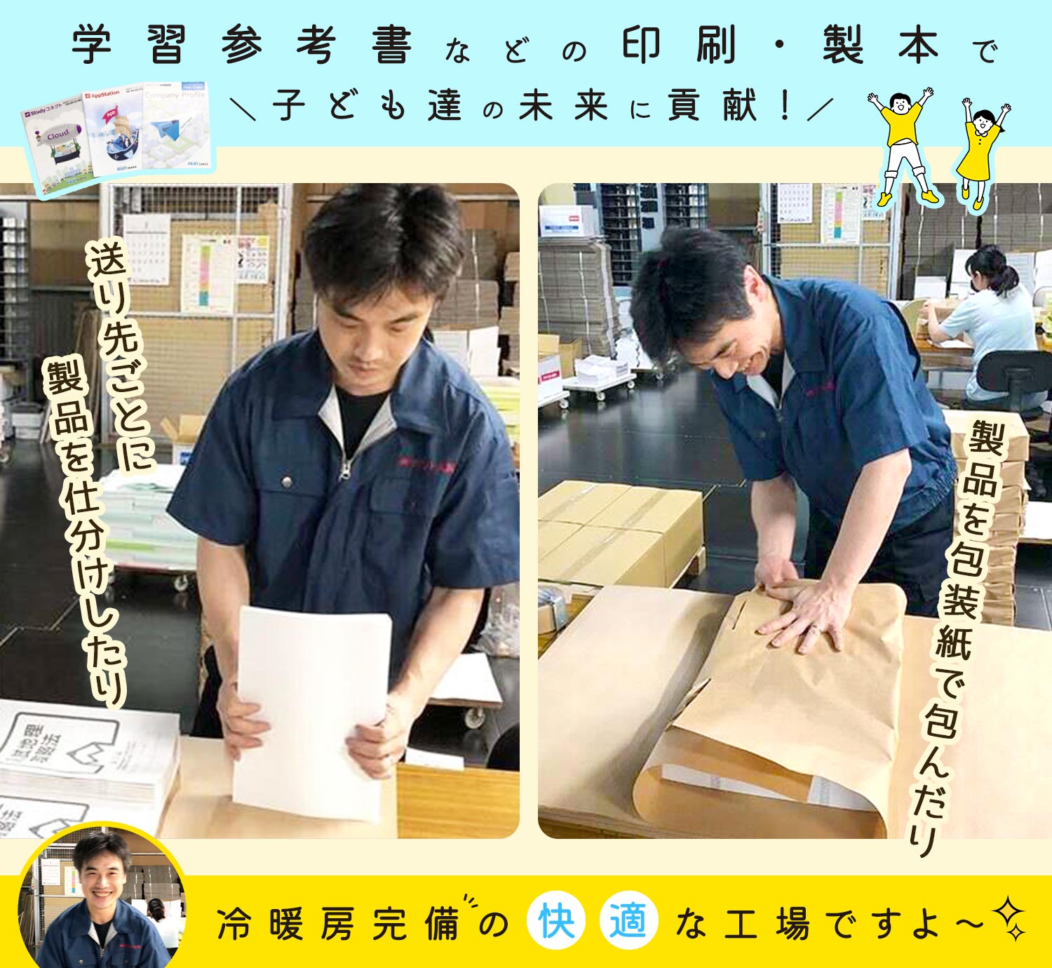 | 仕事内容 | 製造/仕分け・梱包・軽作業[社] 学習塾で使用する教材の印刷・製本を行う当社で、仕分け・梱包・出荷準備などをお願いします。 例) ・製品を包装紙で丁ねいに包む ・送り先ごとに製品を仕分け ・段ボールに製品を詰める ・フォークリフトに乗って、出荷作業 など 1人で黙々と集中して行う仕事なので、そういう働き方が好きな方はぜひお越しください! |