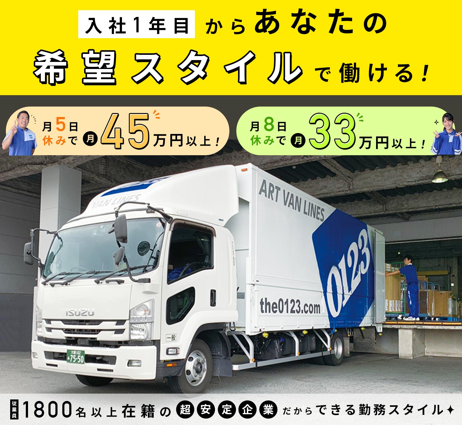 | 職 種 | 4tドライバー[社] (1)月8~9日休み (2)月4~5日休み |
