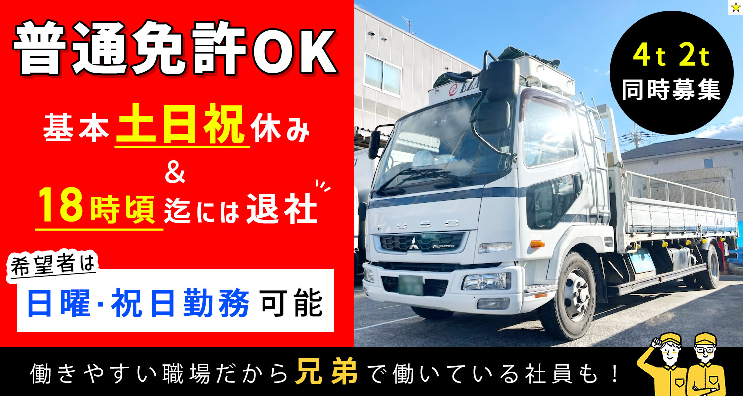 | 仕事内容 | 4トントラックドライバー/軽作業や製造等からも転職歓迎[社] 様々な大手メーカーの商品の配送をはじめ、イベント会場の資材の運搬など、多彩な荷物を運んでいただきます! ※平車(標準4トン平車/荷台の長さ6200㎝、幅2150㎝(後ろにゲート付いてます) ★初任者講習はもちろん、横乗り研修、荷詰めの方法なども丁寧に実施しますので、配送業務が初めての方もご安心ください! ★テールゲートリフター(荷台後部の昇降装置)の、安全な操作を学ぶための講習を受講することが可能! ★ドラレコ・タコグラなど車載設備も充実! |