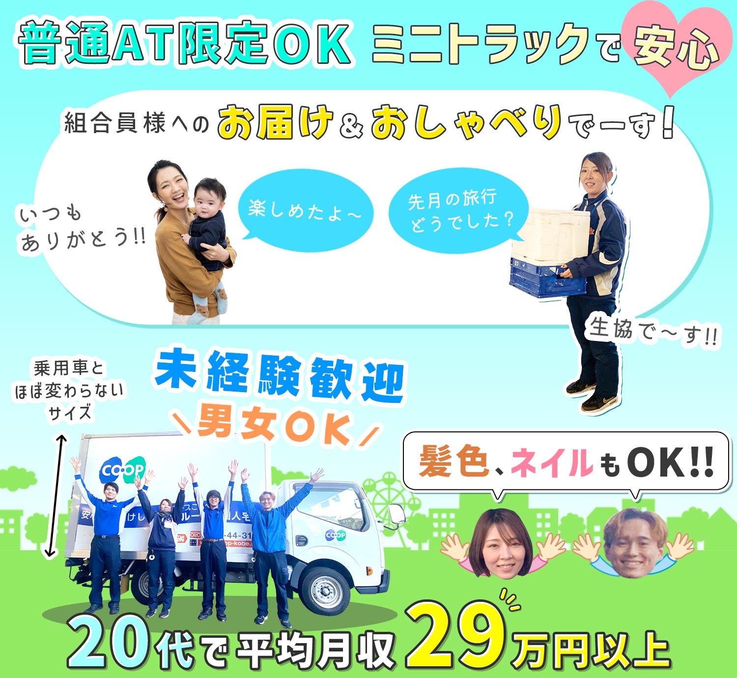当社の配送ドライバーとして、コープこうべの組合員様に対する生協商品の配送をお任せします。