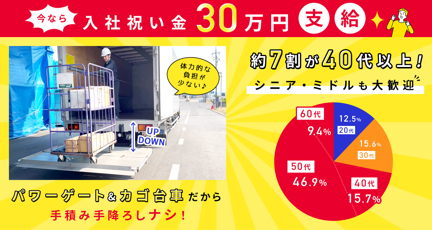 | 仕事内容 | シニアやミドルも歓迎のドライバー/旧普通免許OK[社] 雑貨や日用品等を運ぶ、4トン車での地場・近距離配送(関西圏のみ)をお願いします。※荷役なし 配送は高速道路のみなので、ストレスフリーな運転が可能です。 ※1日2運行でOK ※固定ルート配送 ★手積み手降ろしナシで、カゴ台車を使用して荷物を運ぶので身体的負担も少ない! ★配送時間やルートが決まっているため待ち時間も少なめで、 自家給油設備(インタンク)を導入しており、給油もラクラクです◎ ★事故に伴う処罰や弁済、個人負担なし!(各種保険で対応致します) ★横乗り研修あり 経験を問わず、入社後はトラックの横乗り研修からスタート。 しっかりと先輩ドライバーが研修を行い、商品の扱い方やルートの確認、倉庫での動き方などを丁寧にお教えします! |