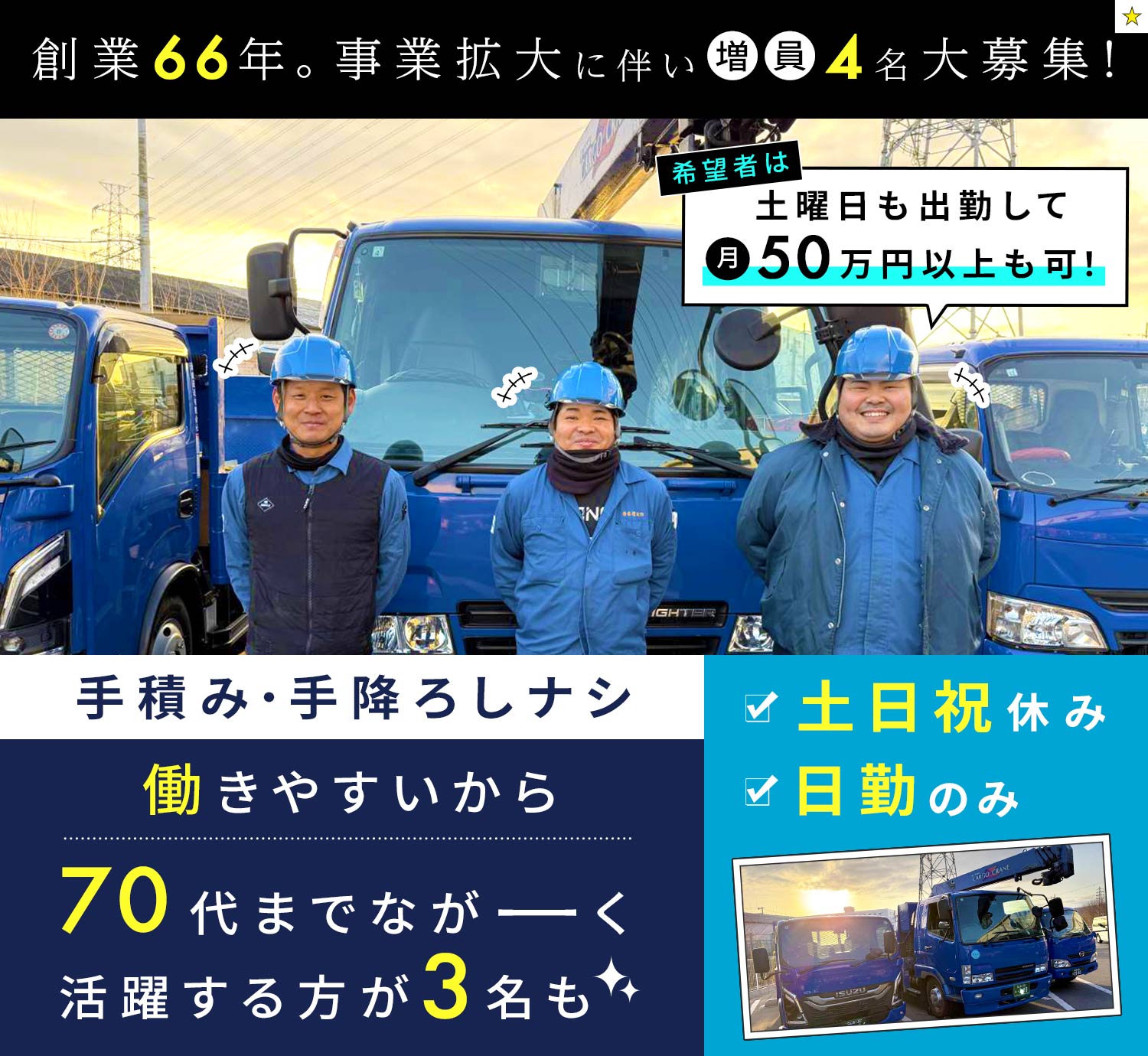 そのため当社では70代3名を含む、幅広い世代のドライバーが活躍中!