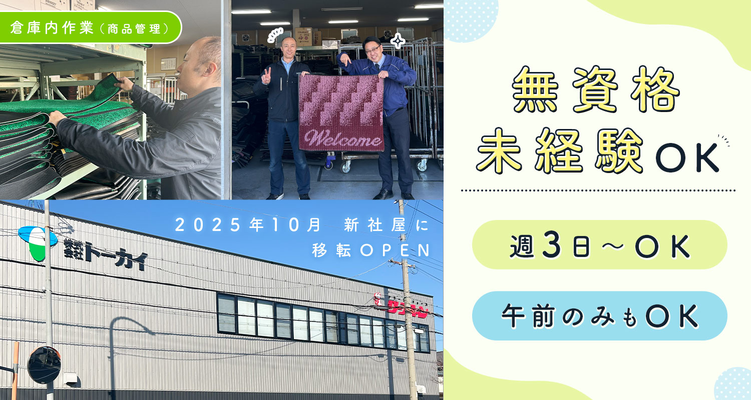| 仕事内容 | 倉庫内作業/軽作業や事務等からも転職OK[パ] クリーニング済のモップやマットなどの積みだしや棚入れ、仕分けをお願いします。 ▼仕事の流れ 08:00 出社/朝礼 08:15 倉庫商品の積みだし 洗いあがったマットの棚入れ/仕分け 12:00 休憩 17:00 退勤 ▼充実した研修制度あり 入社後は先輩がひとつひとつ丁寧にお教えしますのでご安心くださいね。 一通り覚えていただいたら、自分のペースでモクモクと作業できますよ。 ▼2025年完成の新社屋 キレイな職場で、快適に作業に取り組めます☆ |