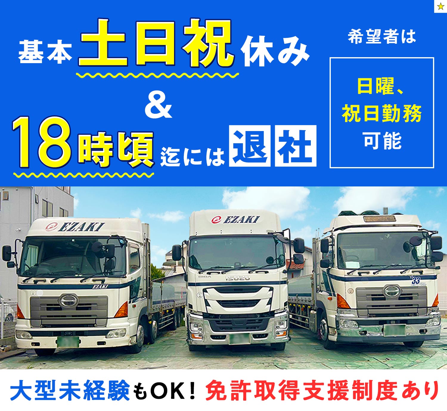 | 応募資格 | 要大型免許 ※大型未経験OK ※学歴・転職回数不問 ※男女ともに活躍中 ※定年65歳・再雇用制度あり ※シニアやミドルも歓迎 <大型免許を取得予定の方もご相談ください> 大型免許の取得支援制度あり(取得費用は会社が全額補助)あり 平成19年(2007年)6月1日以前に普通免許を取得した方、中型免許以上をお持ちの方も応募OK! |