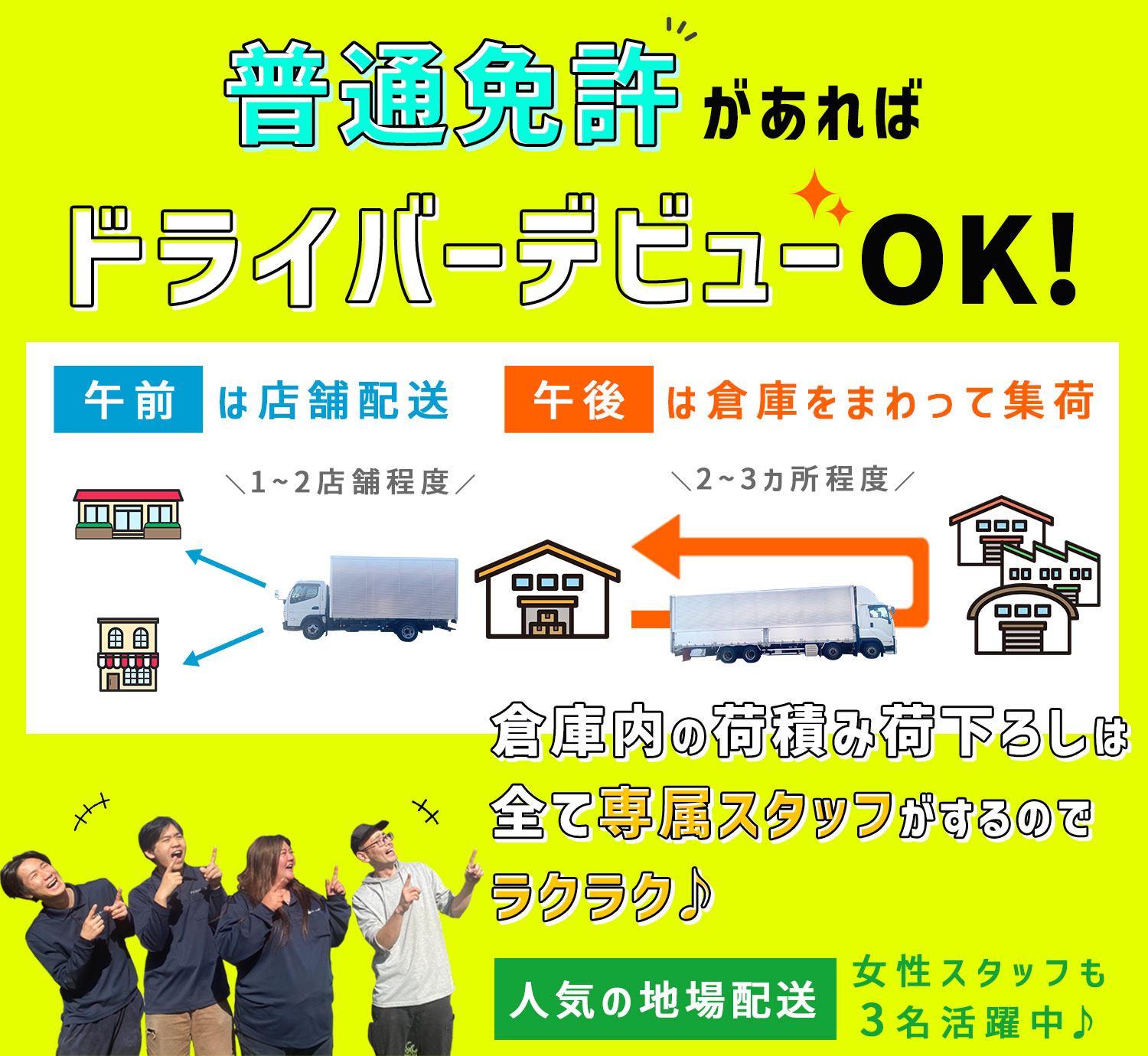 女性でもご活躍いただけます!実際、女性ドライバーが3名活躍しています!