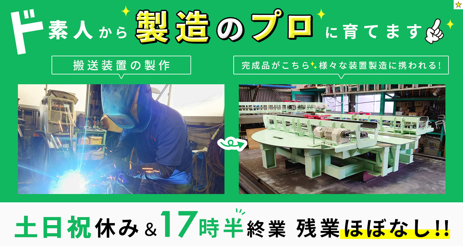 | 仕事内容 | 製造/軽作業等からも転職OK[社] プラント・工場などで使われる搬送装置(製造や塗装・梱包などのラインのコンベア、他)の製造業務をお願いします。 ◆主に塗装と組立を担当 製缶作業などの後に専門ブースにて塗装を実施。 吹き付け塗装が基本で、用途に合わせて焼付塗装を行うこともあります。 そして塗装が完了後、組み立てて完成品にします。 ミリ単位で調整し、最終的な製品チェックも踏まえた工程です。 ◆ステップアップも可能 上記業務の他にも機械設計や現場据え付け工事、電気工事・電気制御など様々な工程がありますので、得意な分野に特化したスペシャリストを目指すのもいいですし、全てを学び、幅広く活躍するオールラウンダーを目指すのももちろんOK! 意欲ある方には電気工事士などの資格取得もバックアップしています。 ◆大手企業との取引多数 これまでの実績と信頼から、名立たる企業との取引実績があります。 スケールの大きな仕事をオーダーメイドで任せてもらえる面白さを味わえますよ! |