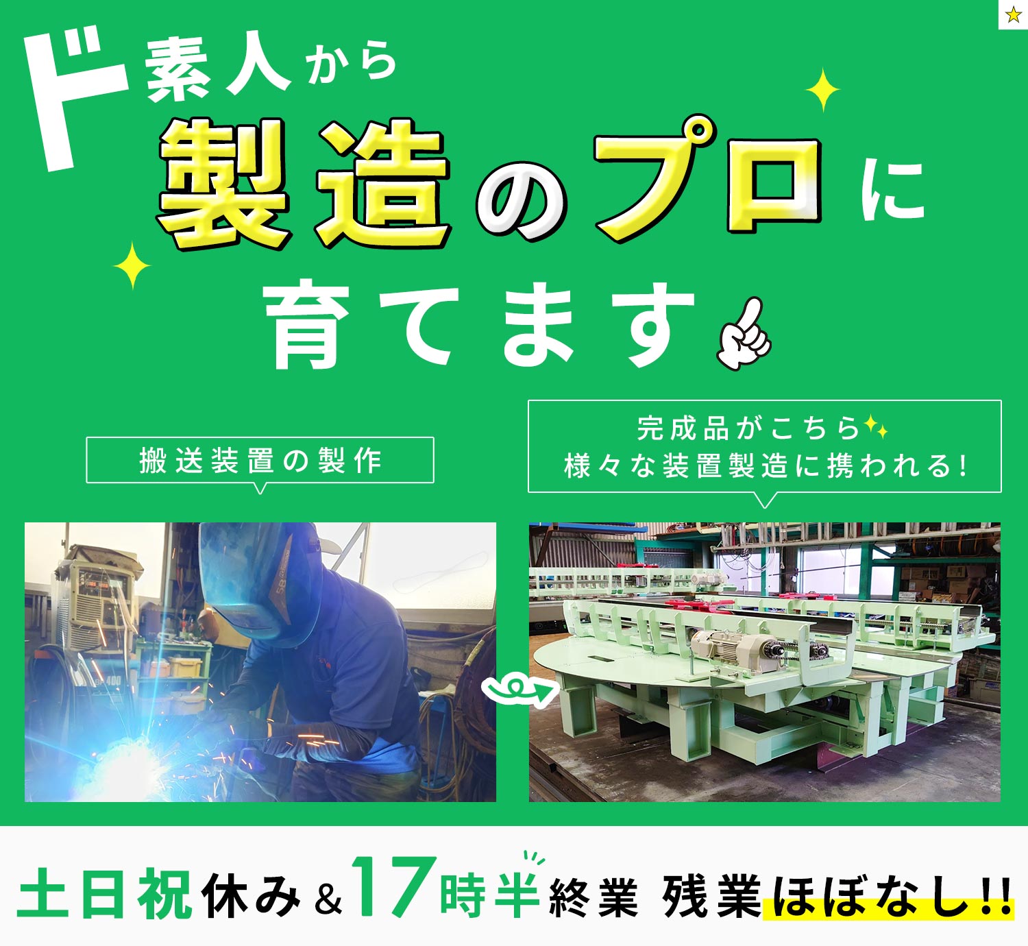 | 応募資格 | 無資格・未経験OK ※製造が初めての方、異業種からの転職大歓迎 ※男女・学歴不問 ※第二新卒歓迎 ※下記のような製造に関する実務経験・資格をお持ちの方は優遇 ・溶接経験 ・電気工事士資格 ・フォークリフト免許 など |