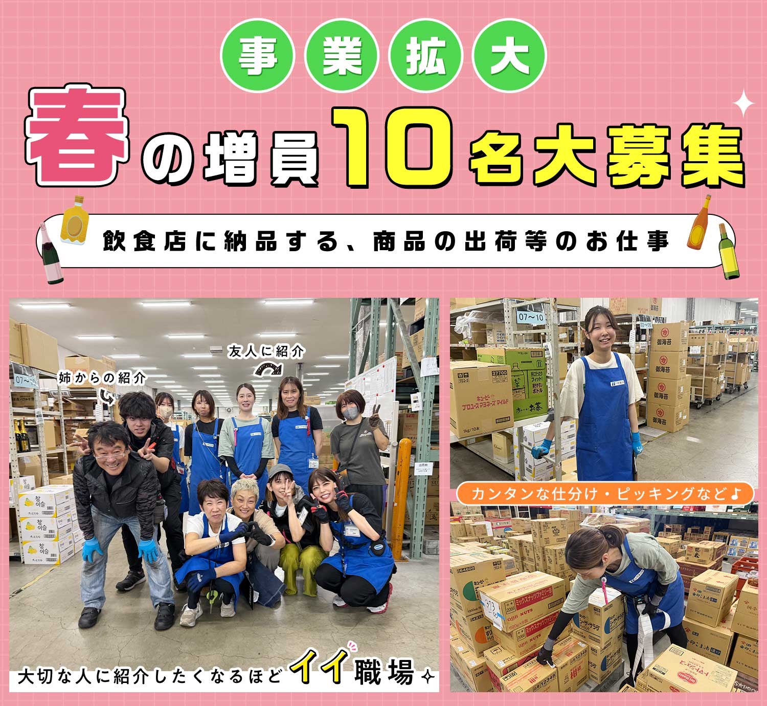 | 仕事内容 | 軽作業・仕分け/シニアやミドルも歓迎[パ] 飲食店に配送する酒類・食品類の出荷作業(ピッキング・仕分け等)、格納作業(荷物を倉庫のラックなどの指定された場所に保管)などをお願いします。 <具体的には> 1.指示書通りに商品を集める 2.納品先ごとに商品を仕分ける 3.倉庫内の指定の場所に保管する など、複雑な作業なし◎ ☆大切な人に紹介したくなる職場 社員・パート問わず、み~んな仲が良いことや柔軟シフトで働きやすいから、家族や友人に紹介して、一緒に働く人もいます! |