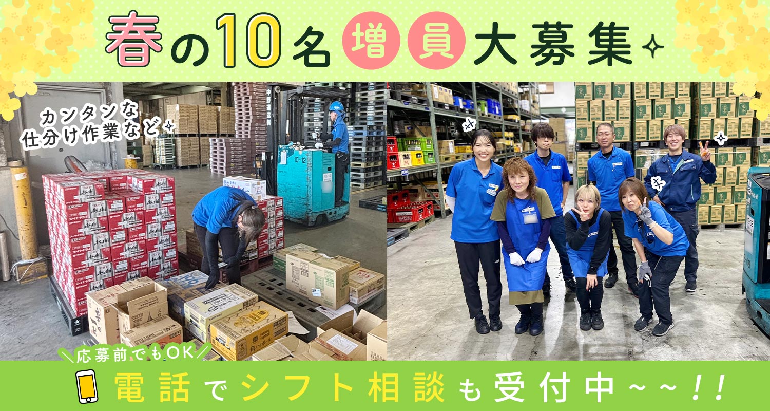 飲食店に配送する酒類・食品類の出荷作業(ピッキング・仕分け等)、格納作業(荷物を倉庫のラックなどの指定された場所に保管)などをお願いします。